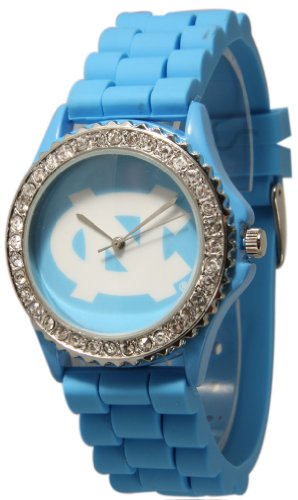 North Carolina Light Blue Collegiate Silicone Ceramic Style watch with matching face of North Carolina State University logo on face and sparkling rhinestones on face circumference.